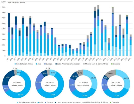 Increasing trends were generally found in all regions (Figure 8). In Sub-Saharan Africa, the average annual investment rapidly increased despite a slight decrease in the percentage share in the 2000s—from US$10 million (3.2%) during the period 1985–1990 to US$42 million (10.4%) in the 1990s, to US$97 million (7.9%) in the 2000s, and to US$2.9 billion (15.0%) in the 2010s. In Europe and Latin America and the Caribbean, sharp increases in the 2000s are remarkable. The annual average investments in NHRE in these two regions increased from US$9.3 million and US$12 million in the 1990s to US$71 million and US$119 million in the 2000s, respectively. The share also expanded from 0.9% and 3.7% to 9.3% and 31.0%, respectively, during the same period. These increases resulted from approval for large renewable projects, including solar PV, solar thermal, and wind power, in Turkey, Mexico, and Argentina. On the other hand, Asia and the MENA experienced significant increases between the 2000s and the 2010s, from US$102 million (8.1%) to US$300 million (14.4%), and from US$27 million (8.5%) to US$192 million (22.9%). In particular, several rounds of funding for the Noor Solar Power Project in Morocco led to the rise in the NHRE finance for the MENA. In Oceania, although the share of NHRE finance was reduced from 45.3% to 28.8% between the 2000s and 2010s, the annual average increased from US$1.1 million to US$6.1 million due to the approval of regional-level sustainable energy project for the Pacific Islands, and renewable energy projects in Kiribati, Micronesia, Solomon Islands, Tuvalu, and Vanuatu.