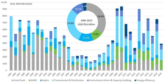 Lastly, the World Bank expanded its commitment to institutional reform and capacity building projects and energy efficiency projects within the non-power sector. The former included various activities to reduce the investment risk and create an enabling environment, and the latter aimed to improve energy efficiency in industries, households, and buildings. Annual average investments and shares in these two sectors continually increased over this period. They reached US$1.1 billion (17.7%) and US$407 million (6.8%), respectively, during the 2011–2019 period, starting from US$256 million (4.0%) and US$43 million (0.7%) during the period 1985–1990 (Table 4).