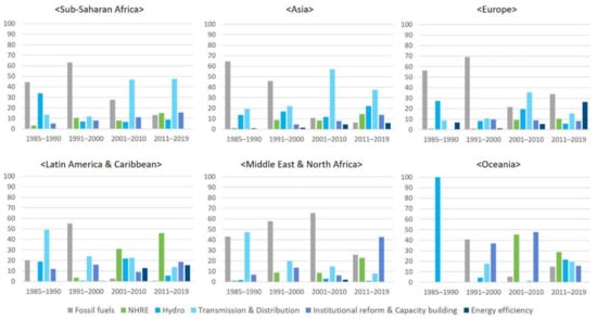 The decreasing trends are found in Asia, Sub-Saharan Africa, and Latin America and the Caribbean (Figure 8). In Asia, fossil fuels received US$2.5 billion per year (64.6%) between 1985 and 1990, but the investments were reduced to US$1.3 billion per year (46.0%) in the 1990s and then to US$136 million per year in the 2000s and the 2010s. The annual average investments were almost the same in the 2000s and the 2010s, but the share fell from 10.8% to 6.6%. In Sub-Saharan Africa and Latin America and the Caribbean, the share of investments in fossil fuels respectively increased from 44.3% and 20.1% for the 1985–1990 period to 63.1% and 55.1% for the 1991–2000 period, but decreased to 27.6% and 2.8% for the 2001–2010 period and 13.0% and 0.9% for the 2011–2019 period. On the other hand, the decreasing trend is unclear in Europe and the MENA. In the MENA region, the annual average and share of fossil fuel investments gradually increased until the 2000s. In the 2010s, the annual average investments increased from US$209 million to US$215 million, but the share contracted from 65.7% to 25.6%. In Europe, the amount and percentage decreased from US$319 million per year (56.4%) for the 1985–1990 period to US$164 million per year (21.6%) in the 2000s, but rebounded to US$313 million per year (33.7%) in the 2010s. Hence, energy finance in Europe and the MENA were heavily concentrated on fossil fuels (47.3% and 40.4%, respectively) between 1980 and 2019 (Table 4).