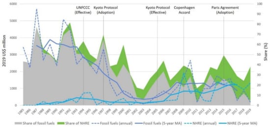 These trends are in accordance with international consensus on the need to tackle climate change and increase renewable energy finance. Figure 9 suggests that anecdotal correlations may exist between increases in finance for NHRE and international climate change negotiations []. Increases in the share of investments in NHRE were brought about around the landmark decisions under the UNFCCC Conference of Parties (COP) to raise funds for climate change mitigation, although they were sometimes transient. The share of NHRE finance increased when the UNFCCC entered into force and after the Kyoto Protocol was adopted. Besides, the amounts and share of NHRE finance significantly increased from around the adoption of the Copenhagen Accord and the Paris Agreement, underlying the importance of climate finance for developing countries.