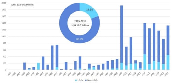 Finally, the World Bank’s finance for NHRE has not been allocated to countries with the greatest need. Out of 28 countries whose electricity access rates were less than 50% in 2018, 26 countries were LDCs. Since most LDCs suffer from low income and face structural barriers that impede sustainable development, they inevitably need more external financial assistance to improve their energy access situation than middle-income developing countries that can attract more private investment. However, the primary beneficiaries of the World Bank’s NHRE finance were relatively wealthy countries, such as Indonesia, India, Turkey, Mexico, and the Philippines. Out of US$16.7 billion invested in the NHRE sector between 1985 and 2019, only US$3.2 billion (19.3%) was distributed to the LDCs (Figure 10). This is not surprising because emission mitigation projects in middle-income countries are regarded as more cost-effective []. A positive trend found in Figure 10 is that the amount and share of NHRE finance for the LDCs increased from the late 2000s. Supporting the NHRE sector in the LDCs can contribute to mitigating GHG emissions and providing universal access to energy. Moreover, Table 7 shows that the MDBs’ role is more important in low-income countries. Therefore, financing for NHRE in the LDCs should be scaled up.