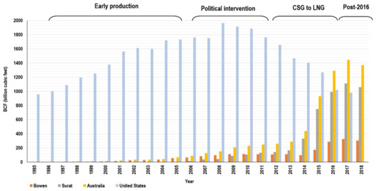 Annual CSG production in Australia and the US [15,16].