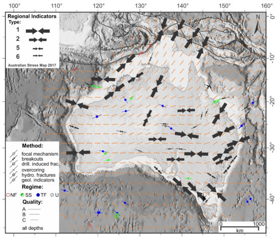 In situ stress pattern of major coal seam gas basins in eastern and central Australia and the smoothed stress pattern (orange lines) showing the regional orientation of maximum horizontal stress [14]. Different symbols show the method of measurement for stress data including focal mechanism solution of earthquakes, borehole breakouts, drilling induced fractures, over coring, and hydraulic fracturing measurements (see [14] for the details of each method). Different colours indicate different tectonic stress regime (NF, normal; SS, strike-slip; TF, thrust; U, unknown). The length of the lines for each stress indicator illustrates the quality of stress orientation based on the World Stress Map ranking criteria [124].