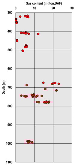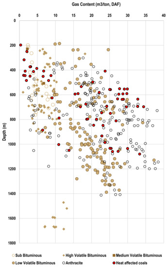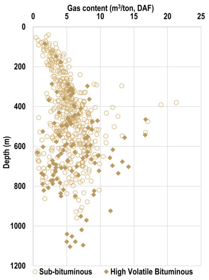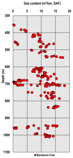 Gas content, gas saturation and permeability are critical reservoir attributes that influence the economics of any CSG project [8]. In Australia, the procedure used to measure gas content follows the Australian Standard (AS 3980:2016) “determination of gas content of coal and carbonaceous material-direct desorption method” (historical editions: AS 3980-1999, AS 3980-1991). Total gas content is the summation of three components; lost gas (), desorbed gas () and residual gas (). Lost gas volume depends on several factors including how quickly a sample is retrieved and placed within the desorption canister, coal diffusion coefficient and diffusion distances (cleat spacing), drilling fluid and free gas volume [20,133]. Gas content is heterogeneous spatially and even vertically within an individual coal seam in Australia. This is consistent with observations in North American coal seams reported by Pashin [134], Pashin [135] and Scott [44]. The primary reasons for these variabilities are interrelated factors including coal rank and depth, thermal effect of magmatic intrusions, hydrogeology and sealing capability of overlying formations [44,77,81,136,137].