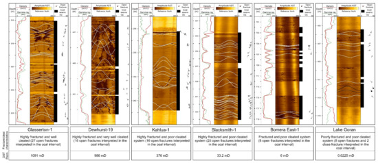 Analysis of high-resolution wellbore image log data in CSG wells have provided the opportunity to further investigate the in situ stress pattern at small scales (i.e., wellbore scale; 1–1000 m). The localised stress variations that occur in the presence of small-scale geological features and localised elastic rock property contrasts play a critical role in subsurface fluid flow in coal seams [81,117,123]. In the detailed analysis of borehole image logs in the Gunnedah Basin, Rajabi, Tingay [121] observed that geological structures, including faults, fracture and magmatic intrusions, strongly perturbed stresses in the region. Following this study, Salmachi, Rajabi [81] investigated the effect of magmatic intrusions on reservoir characteristics of the Hoskissons coal seams in the Gunnedah Basin by the integration of borehole image log interpretation and drill stem test data analysis. In one of the studied wells (Lake Goran 1) with the thickest intrusion (126 m), despite the presence of open fractures, very low permeability was measured. In situ stress analysis in Lake Goran 1 shows large SHmax perturbation with depth (standard deviation of ~40°). It was interpreted that large stress perturbation along this well may have impaired fracture connectivity resulting in low permeability [81].