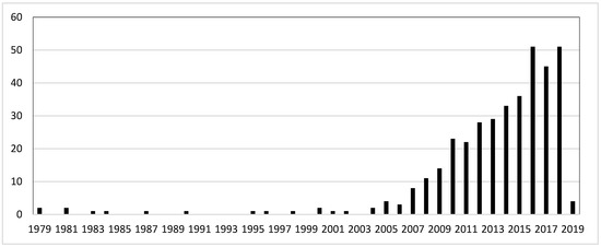 The temporal distribution of articles shows that until 2008 only 16 papers had been published on the topic, with an average of two articles per year. There were also years when the search did not produce any results in the Web of Science (1982, 1988, 1989, 1991–1994, 1997).
