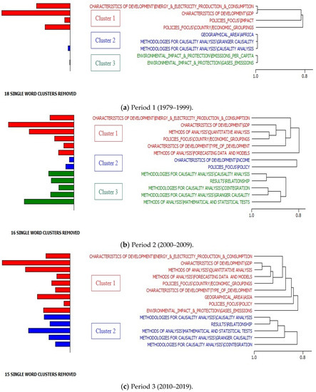 In terms of frequency, the top keywords addressed in the literature that stream from 1979 to 2019 are GDP and GDP per capita, which appear in 368 cases that are part of the sample. The situation is similar for all three periods. This result is confirmed by other previous studies based on literature reviews that analyze the relationship between energy and economic growth [23,48,49].