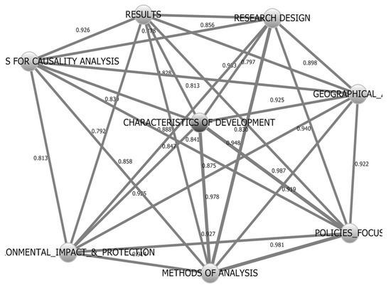 Regarding the connection between categories, it is observed in Figure 4 that the strongest connection is between the methods of analysis and policies focus, followed by the one between the characteristic of development and the methods of analysis. The link between research design and method of analysis, environmental impact and protection, and policies focus is also relevant.