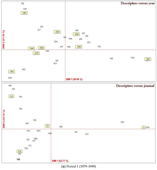 In the first period 1979–1999, descriptors such as EUR and EQL are characteristic to research conducted and published around 1984, while ASI and TOD are located near each other in the right half of the map, and both close to 1981. Many descriptors are plotted above the intersection of the two dimensions described by the map, in proximity to 1996 and 1998 years. This states the fact that such descriptors are more characteristic to research specific to 1996 and 1998, than others. For instance, the location of ASI and TOD shows a smaller frequency of utilization in articles from 1996 and 1998.