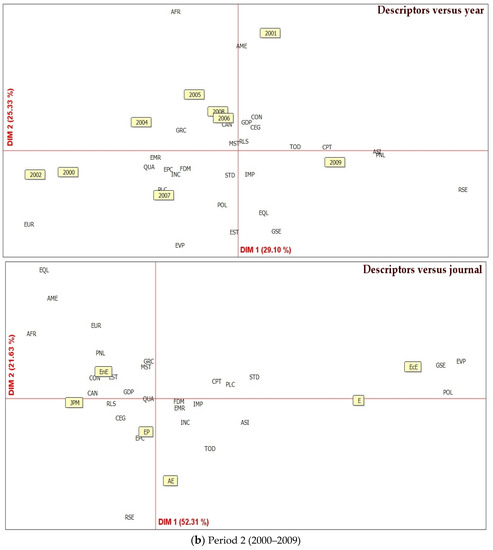 The results of this step are two proximity maps where keywords are depicted along two axes (descriptors versus year of the articles’ publication; descriptors versus journals) for the analyzed periods (Figure 5). If two descriptors appear closer in the map, it means that the pairs of keywords are jointly associated in a significant portion of articles [71]. In the horizontal dimension, we found the most common issues investigated in this area.