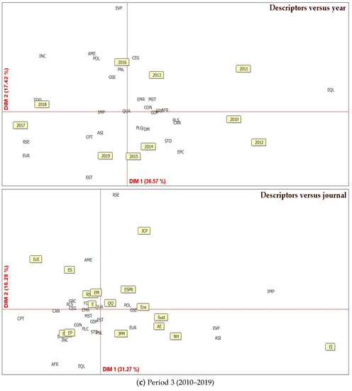 As for the 2010–2019 period, the map shows a clear separation of descriptors on the right side of the map and on the left side of the map, as the time shifts from 2010 to 2015 (right) and from 2016 to 2019 (left). Years 2013, 2014, and 2016 each have in their proximity at least four descriptors associated to research related to the economic growth–energy consumption relationship. A highly discriminating descriptor is EQL, as it lies farther from the origin (Figure 5c). This descriptor also has an interesting movement within the maps, from the upper left half in 1979–1999 to lower right half of the map in the second period, and to the upper right half of the map in the last period.