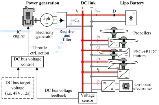 The UAV power unit must balance two opposing requirements: (i) the need for sustained power production (i.e., energy capacity) in order to achieve flight endurance, and (ii) the need for peak load leveling to achieve satisfactory in-flight dynamic performance (in terms of maneuvering capability). Purely electrical propulsion, which is commonly used in multirotor UAVs employs an electrochemical battery for energy storage and power production [30], and has the advantages of a fast load compensation (response time within milliseconds), whereas the electrical propulsion using electric motors coupled to propellers offer a distinct advantage of very precise and highly dynamic thrust control. This represents the key motivation for retaining the battery energy storage within the hybrid power unit and electrical power transmission system using a common DC bus for power distribution, with electrical motors powering the propellers.