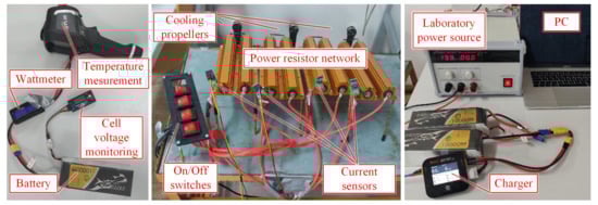 The experimental characterization procedure consists of two phases: (i) the initial intermittent discharge test intended for OCV vs. SOC curve identification, and (ii) the continuous discharge test used for the recording of the battery equivalent circuit series resistance vs. SOC characteristic over a wide range of battery state of charge values. Measurements were conducted on a developed test bench, consisting of appropriate sensors, data acquisition, and load with cooling propellers (see Figure 3). A network of parallel dissipation resistors (with 4 Ω in a single parallel branch) is used as a battery load, thus obtaining the required battery discharge current profiles, while honoring the safe range of battery operating voltage.