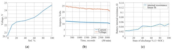 LiPo Battery identification: (a) OCV vs. SoC; (b) Continuous discharge curve example (2 ohm load); (c) Experimentally–recorded and extracted internal resistance vs. state of discharge (1−SOC), for discharging operation.