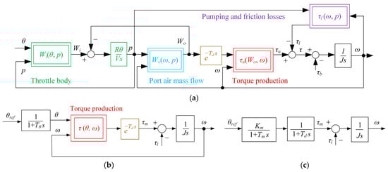 In the case of a small-volume intake manifold, typically valid for a small, low-power engine, intake manifold air filling dynamics would be very fast, and, thus may be neglected. Thus, the MVEM model can be simplified to a first-order model, and it should still be valid for engine control applications if the bandwidth of a control system is relatively low [36]. By neglecting the intake manifold dynamics, a simplified model (with throttle dynamics) is shown in Figure 5b.