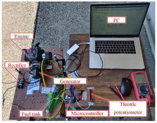 where is the mechanical power at the ICE output, and is the electrical power transferred from the generator to the load (i.e., power at the dissipation resistor grid). Since the engine can produce 1.8 Nm of torque at 10,500 rpm, what would correspond to the mechanical power of 1980 W. Under these conditions, electrical power dissipated that the load is 1500 W, and the overall efficiency of the hybrid power system is estimated to the aforementioned value of 0.75.