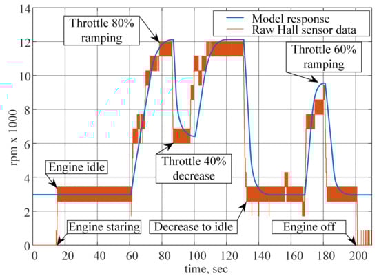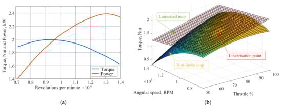 Single torque–throttle–rpm map is obtained from breaking torque/power curve provided by the manufacturer (Figure 7a) and suitable sizing methodology, i.e., as shown in [37]. The moment of inertia is estimated by using CAD models. Nonlinear map torque-rpm-throttle has been linearized (see Figure 7b) in the vicinity of the anticipated engine operating point, characterized by the throttle opening of approximately 70% opening of the full scale, and engine speed of 9500 rpm, by using related numerical tools within. MATLAB/Simulink™ software.