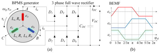 Figure 8a shows the simplified electrical circuit of the three-phase BPMS EG with rotor permanent magnets and its connection to the three-phase full-wave diode rectifier, whereas Figure 8b shows the trapezoidal back-emf waveforms of individual EG phases.