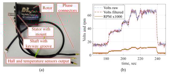 The aforementioned motor constant is confirmed by measurements based on the ramping of the voltage throttle command from zero to maximum and recording the rotational speed (rpm) and phase voltage profiles (Figure 9b). Measurements were conducted on the ICE-EG set test bed (Figure 6), with a mechanically coupled EG and ICE as a prime mover, with speed measurement based on Hall–effect sensors, and armature voltage measurements based on a suitable resistor divider network and analog–to–digital converter embedded on the microcontroller unit used for data acquisition. Electrical machine winding resistance and inductance are measured utilizing a precise laboratory LCR meter. Phase–to–phase quantities are measured for each possible phase–to–phase combination and the phase impedance components (resistance and inductance ) are calculated as average values obtained by measurements.