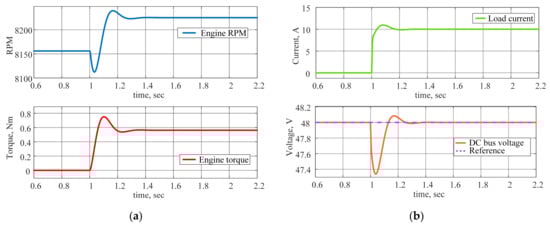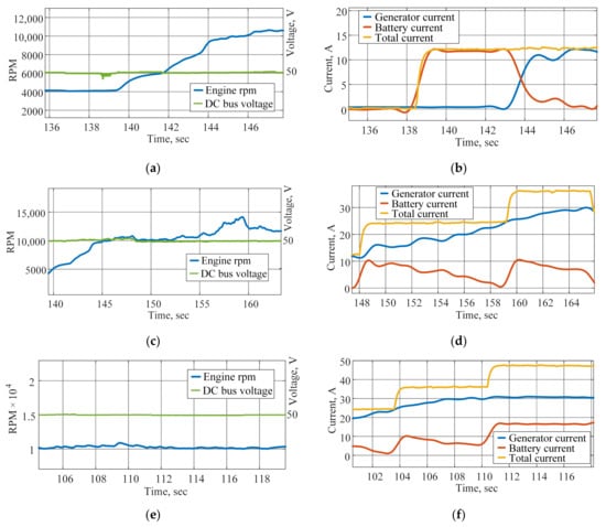Results for medium-high and high load regimes are shown in Figure 18c,d. Engine ramps up its rpm to approximately between 13,500 rpm and 14,000 rpm. As was the case for low load, the battery initially supplies DC bus load until the EG takes over, with the average generator load being around 30–35 A, thus corresponding to 1500–1750 W of power consumption at the load dissipation resistor network. Again, DC bus voltage is maintained near the target value of 50 V without significant voltage drop excursions.