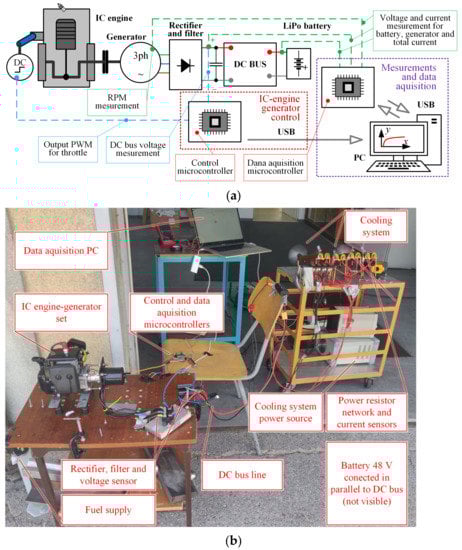 The second microcontroller used solely for data acquisition only is equipped with current sensors for the EG current, battery current, DC bus total current, rpm hall sensor, and DC bus voltage sensor. Data acquisition is executed within the MATLAB/Simulink™ software environment, using the so-called simulation model “external mode” execution thus facilitating real-time telemetry.