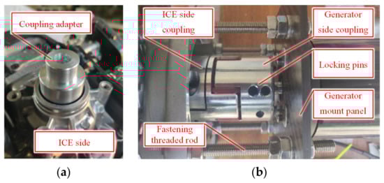 In order to have a safe and reliable connection between the ICE and EG, a claw coupling of sufficient torque rating is used. It is secured using an appropriate adapter with a conical hole on the engine side to connect it to the engine shaft (Figure 15a). On the EG side, the coupling must be fixed using a screw characterized by sufficient strength to withstand the load torque variations due to the stroke-based operation of the ICE (see locking pins in Figure 15b).
