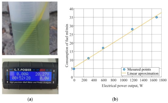 Each test was conducted under steady-state load conditions, by keeping the engine in the particular operating regime for over 5 min. For each steady-state load case, initial and final volumes of fuel were measured using the graduated cylinder tank (as shown in Figure 17a). Each test was repeated five times to obtain a reliable fuel consumption estimate. The final results of averaged fuel consumption for each operating regime are shown in Figure 17b. The presented results indicate that fuel consumption characteristic is practically linear with respect to the EG unit electrical load.