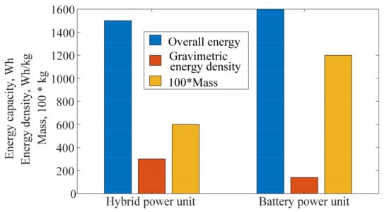 - For the aforementioned increase in the gravimetric energy density using a hybridized ICE + EG power unit, the overall mass of the hybrid power system is two times smaller when compared to the comparable battery-based system.