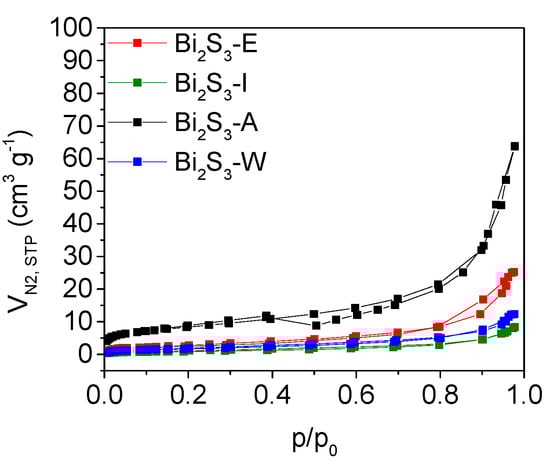 The porous structure of the synthesized Bi2S3 using various solvents was recognized by N2 sorption at 77 K. The mesoporous character of all bismuth sulfides are corroborated by the hysteresis loops (Figure 1). The BET surface area of obtained samples was relatively low, as suspected for pristine inorganic materials. The highest BET value of 32 m2 g−1 was noticed for Bi2S3-E, while the lowest value of 17 m2 g−1 for Bi2S3-I. The structural parameters of the obtained samples are included in Table 1. Moreover, among the four discussed samples, two groups with comparable porous structure parameters can be distinguished. The first group consists of the Bi2S3 samples synthesized using acetone and ethanol as solvents, while the second group consists of bismuth sulfides obtained in isopropanol and water environments. Notably, within both groups, it is clearly seen that the porous texture of Bi2S3 is more developed when the synthesis is carried out using acetone and ethanol as solvents. The VT of the samples ranges from 0.080 cm3 g−1 to 0.121 cm3 g−1 for Bi2S3-W and Bi2S3-A, respectively. Some differences are observed in the case of Vmes, which varies from 0.067 cm3 g−1 for Bi2S3-I to 0.088 cm3 g−1 for Bi2S3-A.
