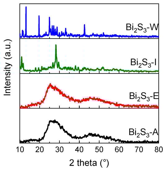 The XRD patterns (Figure 2) present different crystalline structures depending on the synthesis solvent. An amorphous phase is recorded for Bi2S3-A and Bi2S3-E. The XRD pattern of Bi2S3-I reveals the appearance of some characteristic of a primitive orthorhombic crystalline structure of Bi2S3 (JCPDS 17-0320). Results can suggest that when isopropanol is applied as the synthesis solvent, crystalline structure is not fully formed and isopropanol led to intermediate form between crystalline and amorphous phase. Moreover, the crystalline phase of Bi2S3 is clearly observed when water is the synthesis environment, and the diffraction peaks correlate with the Bi2S3 orthorhombic phase. The diffraction planes are assigned in agreement with the standard diffraction pattern of Bi2S3 (JCPDS 65–2435). The different crystalline structures of the obtained bismuth sulfides indicate that the kind of solvent strictly affects the crystalline structure. In addition to the influence of the solvent type, the formation of crystalline structure of bismuth sulfide can be also achieved by the Bi2S3 treatment at a growing temperature [27]. No impurities or Bi2O3 phases are observed in the materials synthesized via the proposed precipitation method with ammonium sulfide.
