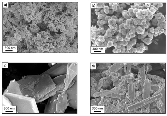 FESEM was employed to compare and contrast the surface morphologies of the bismuth sulfides synthesized using various solvents. The observations reveal discernible differences in the Bi2S3 morphologies (Figure 3). The use of distinct solvents leads to Bi2S3 with different particle shapes. Coral-like particles of Bi2S3 are obtained when ethanol or acetone is used as the solvent. However, the Bi2S3-E particles are significantly smaller than the Bi2S3-A particles and do not exceed 100 nm, whereas the Bi2S3-A particles can have a diameter of 250 nm. Moreover, the size of particles can affect the porous structure of Bi2S3. It was observed that the size of bismuth sulfide particles increases in the sequence Bi2S3-E < Bi2S3-A < Bi2S3-W < Bi2S3-I, which is in accordance with the decreasing BET surface area of bismuth sulfides.