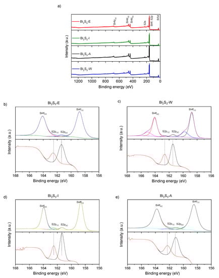 To further analyze the surface chemical composition and oxidation state of the Bi2S3 samples synthesized in different solvents, XPS was performed, and the results are shown in Figure 4. The XPS survey spectra presented in Figure 4a explicitly reveal the presence of only Bi and S, suggesting the purity of the obtained bismuth sulfides. The Bi and S peak positions agree well with those in other papers [23,24]. The high-resolution Bi 4f and S 2p spectra of the obtained bismuth sulfides are shown in Figure 4b–e. The two strong peaks at binding energies of 158.9 and 164.2 eV correspond to the Bi 4f7/2 and Bi 4f5/2 in Bi2S3, respectively [28]. The bismuth sulfides synthesized using ethanol, isopropanol, and acetone as solvents are characterized by the nearly symmetrical shape of their peaks, which is attributed to the pure phase of the Bi2S3 surface. In the case of bismuth sulfide obtained in water, two extra signals, leading to some distortions on the shoulders of the Bi 4f7/2 and Bi 4f5/2 peaks, are observed. This feature can be attributed to the heterogeneous composition on the surface of Bi2S3. Moreover, the two peaks with lower intensity located between Bi 4f7/2 and Bi 4f5/2 can be ascribed to S 2p3/2 (161.1 eV) and S 2p1/2 (162.2 eV), confirming the valence state of sulfur as S2− [29].
