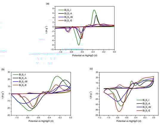 The results of the CV measurements, presented in Figure 5, show distinguishable redox peaks related to the faradaic reactions of the Bi2S3 nanostructures. At a low scan rate, where the current response is diffusion controlled, two pairs of anodic/cathodic peaks appear [30]. The first pair is attributed to the reaction of Bi2S3 with OH- ions, and this pair originates from the change in the bismuth valence state (−0.6 and −0.45 V, Figure 5a) [23]. Moreover, Bi2S3 prepared from isopropanol presents a peak shift towards more negative values compared with the rest of the synthesized materials. The second pair is related to the adsorption of hydrogen in the lamellar structure of Bi2S3 (−0.85 V), while the anodic peak at −0.3 V is related to hydrogen oxidation during the electrochemical measurements. [25,31] As the scan rate increases to 100 mV s−1 (Figure 5b,c), the cathodic peaks become very wide, and a shift of both the anodic and cathodic redox peaks is observed, indicating the change in the internal resistance of the electrode and the quasi-reversible nature of the faradaic reaction. The faradaic reaction of bismuth sulfide is described according to the following Equation: