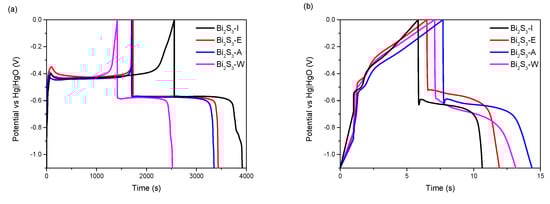 Figure 6. Charge–discharge profiles of the bismuth sulfides recorded at 0.5 A g−1 (a) and 10 A g−1 (b).