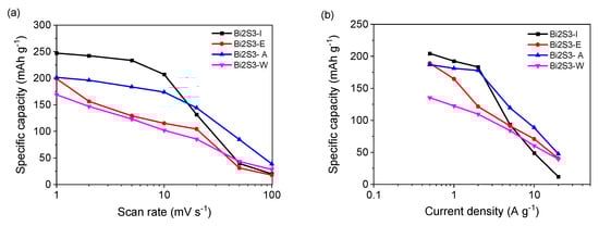 Figure 7. Specific capacity versus scan rate (a) and discharge current density (b) of the bismuth sulfides.