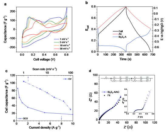 Figure 8. CV curves at the different scan rates (a), GCD curves at a current density of 0.2 A g−1 (b), cell capacitance versus scan rate/discharge current density (c), and the Nyquist plot with an inset representing the high-frequency range and the equivalent circuit diagram (d) of the hybrid capacitor based on the Bi2S3-A and AC electrodes.