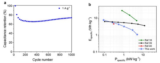 Figure 9. Cycling stability at a current density of 1 A g−1 (a) and the Ragone plot of the specific energy–power density relationship of the hybrid capacitor and other various hybrid devices (b).
