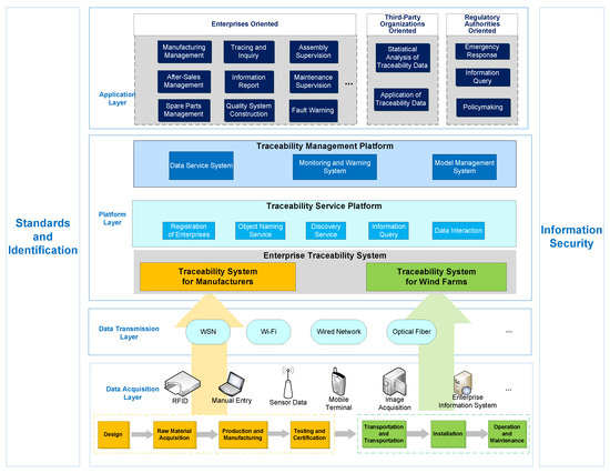 The existing traceability systems can be roughly divided into systems with a centralized architecture and systems with a distributed architecture. Compared to the centralized system, the distributed system has higher cost performance, stronger processing capacity, higher reliability, and better scalability. Meanwhile, as a response to distributed energy, wind energy enterprises should implement more decentralized systems that can meet the expectations of the environment, the economy, and society [13]. However, the distributed system has problems with data tampering and information disclosure. Given the large scale of both manufacturing enterprises of wind turbines and wind farms, a semi-centralized IoT-based traceability architecture was proposed in this study. The proposed architecture can fully integrate all data types, disperse data pressure, improve traceability efficiency, and effectively protect enterprise business information. Based on the proposed architecture, a new traceability platform for wind turbines was developed by studying the characteristics of the key components of wind turbines, the information collected during each stage, and various user needs. The developed platform extends the traceability chain by increasing the amount of collected information on the operation, maintenance, recycling, and disposal stages to realize the traceability of the whole life cycle.