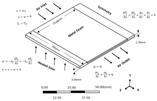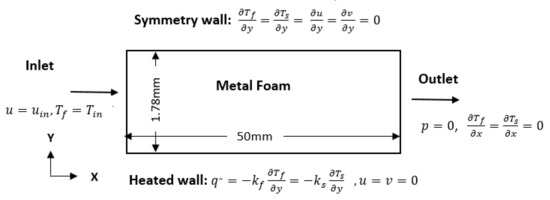 A preliminary numerical study was conducted in order to elucidate the effect of porosity and pore density of aluminum foam on its cooling capability. The study was also used to ascertain the effect of air velocity through the foam on heat dissipation. A summary of this study will be given here, however, more details relevant to this study will be elaborated on in Section 2.2 in conjunction with the simulation presented therein. The preliminary study was 2-dimensional (Figure 1). It simulated a channel between two parallel plates filled with aluminum foam and cooled by air. The two plates comprising the channel represented adjacent fuel cells in a stack. Each plate was subjected to a heat flux of 2.5 W/cm2. The dimensions of the metal foam sheet between them were 50 mm × 3.56 mm. Different pore densities of 20, 40, 80, and 100 pores per inch (ppi) with different porosities of 60, 70, 80, and 90% of the foam were investigated. Average inlet air speeds for each case ranged from 0.2 to 3 m/s. One-half of this channel was simulated taking advantage of the symmetry. The solution domain and boundary conditions are shown in Figure 1.