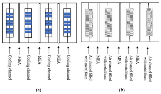 (a) Current fuel-cell stack with water-cooling serpentine small channels; (b) fuel-cell stack with shoulders of small channels removed creating one large channel filled with metal foam for air-cooling. MEA stands for Membrane Electrode Assembly.