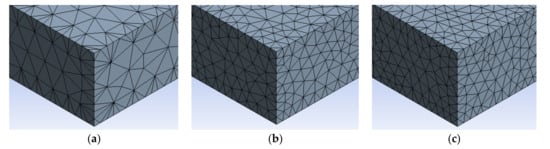 Medium-smoothing-quality meshes were applied to all designed geometries with a de-feature size of 5 × 10−3 mm. Mesh quality and smooth transition inflation were checked with 0.272 of the transition ratio. The smooth transition option was recommended by ANSYS based on the geometry of the model. This option calculates the local initial height of tetrahedral elements according to the total height of the elements, so that the rate of volume change, and the transition between each layer, are smooth. The transition ratio is the volume-based growth rate of the last tetrahedral elements. It works best for planar surfaces. ANSYS automatically assigns a transition ratio of 0.272 for a smooth transition. Double precision and serial processing options were selected. For pressure–velocity, the coupling simple scheme solution method was selected. Least squares cell-based gradient spatial discretization, PRESTO solution method for pressure, and second-order upwind for momentum and energy were applied. For all monitors for checking convergence, absolute criteria were chosen to be equal to 10−6.