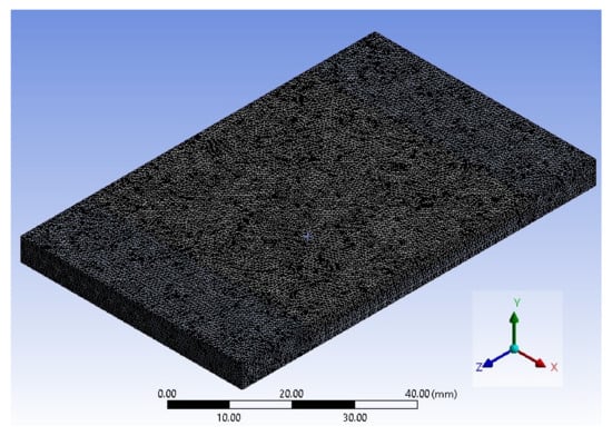 For simulation purposes, the geometry of the water-cooling field of the commercial stack, EFC-100-03-6-ST, was built in a 3D physical design in SolidWorks and imported into ANSYS-CFD. However, all shoulders between the serpentine small channels in the bipolar plate were removed, which made the cooling field one large channel having dimensions (L × W × H) 100 mm × 73.66 mm × 3.56 mm. The new design for air cooling stipulates that this large channel is filled with metal foam in order to dissipate heat more efficiently to air that will flow through it, as shown in Figure 3. In the simulation, the actual fuel cells including the bipolar plates were replaced by 100 mm × 100 mm × 7.12 mm aluminum plates. One large air-cooling channel was machined along with each plate. The depth of this channel was 3.65 mm.