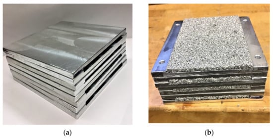 (a) Aluminum plates with open cooling channels representing bipolar plates in the commercial stack EFC-100-03-6-ST, (b) cooling channels filled with aluminum foam; one channel uncovered to show metal foam.