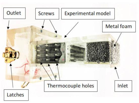 Aluminum foam having 40 ppi with a porosity of 90.3% was obtained commercially [49]. The foam needed to be mechanically compressed in order to achieve 60% porosity (same porosity as in the simulation). The compression was done according to Boomsma et al. [50]. To house the experimental model, a test section was constructed of Plexiglas pieces glued together as shown in Figure 9. The inlet of the test section had dimensions 3.98 cm × 7.62 cm (1.57 in × 3 in). In order to get a uniform velocity profile entering the experimental model (as in the simulations), a piece of metal foam was inserted into the inlet of the test section at 3.81 cm (1.5 in) from the experimental stack. The outlet of the test section was enlarged to a square cross-section of 12.50 cm in order to be connected to the inlet of a suction machine by latches. Twelve holes were drilled on the left side of the test section, through the Plexiglas, for inserting thermocouples for measuring plate temperatures at various locations, Figure 9. One other hole was drilled on the right side of the test section for heater wires.