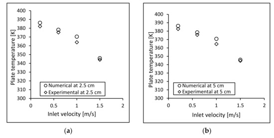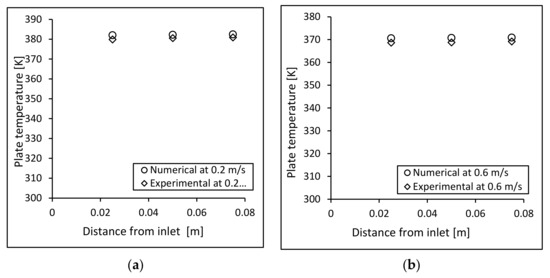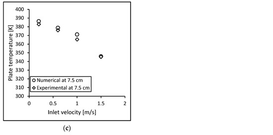 Figure 12 shows that the general behavior of the local temperature for an end plate is similar to that of an internal plate, meaning that the local temperature increases in the flow direction since the air heats up as it travels through the foam. In addition, the agreement between the experimental and numerical temperatures is very good, especially for the lower velocities 0.2 and 0.6 m/s (Figure 12a,b). For the higher velocity of 1 m/s, part (c) of the figure, there is a little difference between the experimental and numerical temperatures, with the numerical analysis over-predicting the local plate temperatures. As expected, the local temperature decreases as the velocity increases due to increased convection rates at higher velocities. The temperature value for an end plate is lower than that of an internal plate because an end plate is heated from one side only.