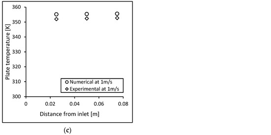 Comparison between experimental and numerical results for end plate 1: Temperature along plate length for flow velocity: (a) 0.2 m/s; (b) 0.6 m/s; (c) 1.0 m/s.