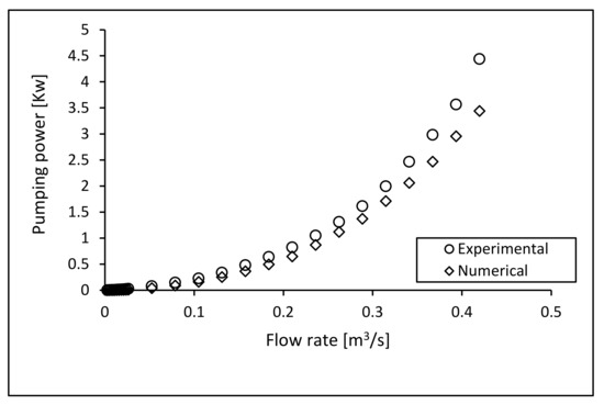The numerical and experimental results of the pressure drop were used to calculate the pumping power. Equation (23) was used to calculate the pumping power: