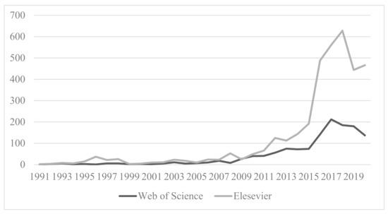 Over the last three decades, a great number of publications in the Web of Science and Elsevier databases (more than 5000) have dealt with urban energy (Figure 1), with a significantly increasing trend observed every year. There are more than 600 publications on urban energy from 2018 in the Elsevier database. Furthermore, Trianni et al. [32] analyzed the trends for academic debate and research in the Energy Efficiency journal.
