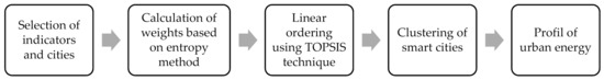 The present study focused on the assessment of urban energy. The research was conducted in three steps: selection, evaluation, and classification (Figure 3). The test procedure consisted of several successive stages: (1) the choice of indicators and objects; (2) the construction of the normalized decision matrix; (3) the calculation of criterion weights based on entropy method; (4) linear ordering using TOPSIS method; (5) clustering of cities; (6) conclusions and recommendations.