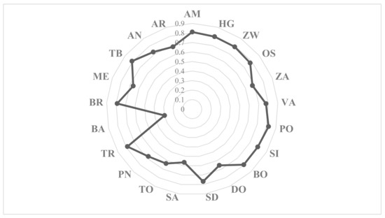 Using the values of the relative closeness coefficient, a four-level classification of smart cities can be derived based on the assessment of urban energy. Table 8 presents the classification of smart cities by their level of urban energy. From the table, it can be seen that none of the sample smart cities reached the ‘excellent’ status with regard to its urban energy. The majority of smart cities (thirteen) were with the ‘good’ status and was above . ArRiyadh (AR), Zagreb (ZA), Piedras Negras (PN), Melbourne (ME), Doral (DO), and Toronto (TO) belong to group III, with between and . Two cities (SA, BA) were with the ‘low’ status and below .